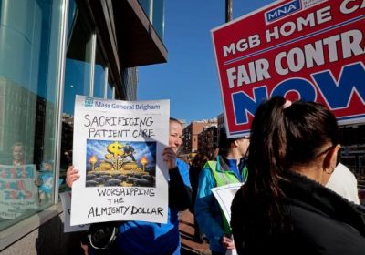 家庭护理医护人员正敦促麻省总医院布莱根医疗体系协助他们的工会达成首份合同,他们表示这份合同对于改善工作量、工作条件和患者安全至关重要。家庭护理部门的 unionized clini…
