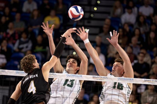 加州尔湾讯 —— 杰克逊·克里斯特连发两记ACE球终结第四局,此前夏威夷大学握有五个冠军点。最终二号种子长滩州立大学以惊心动魄的20-25、27-25、22-25、30-28、15-11击败彩虹勇士队,在今晚布雷恩活动中心捧起Outrigger大西部联盟男子排球冠军奖杯。